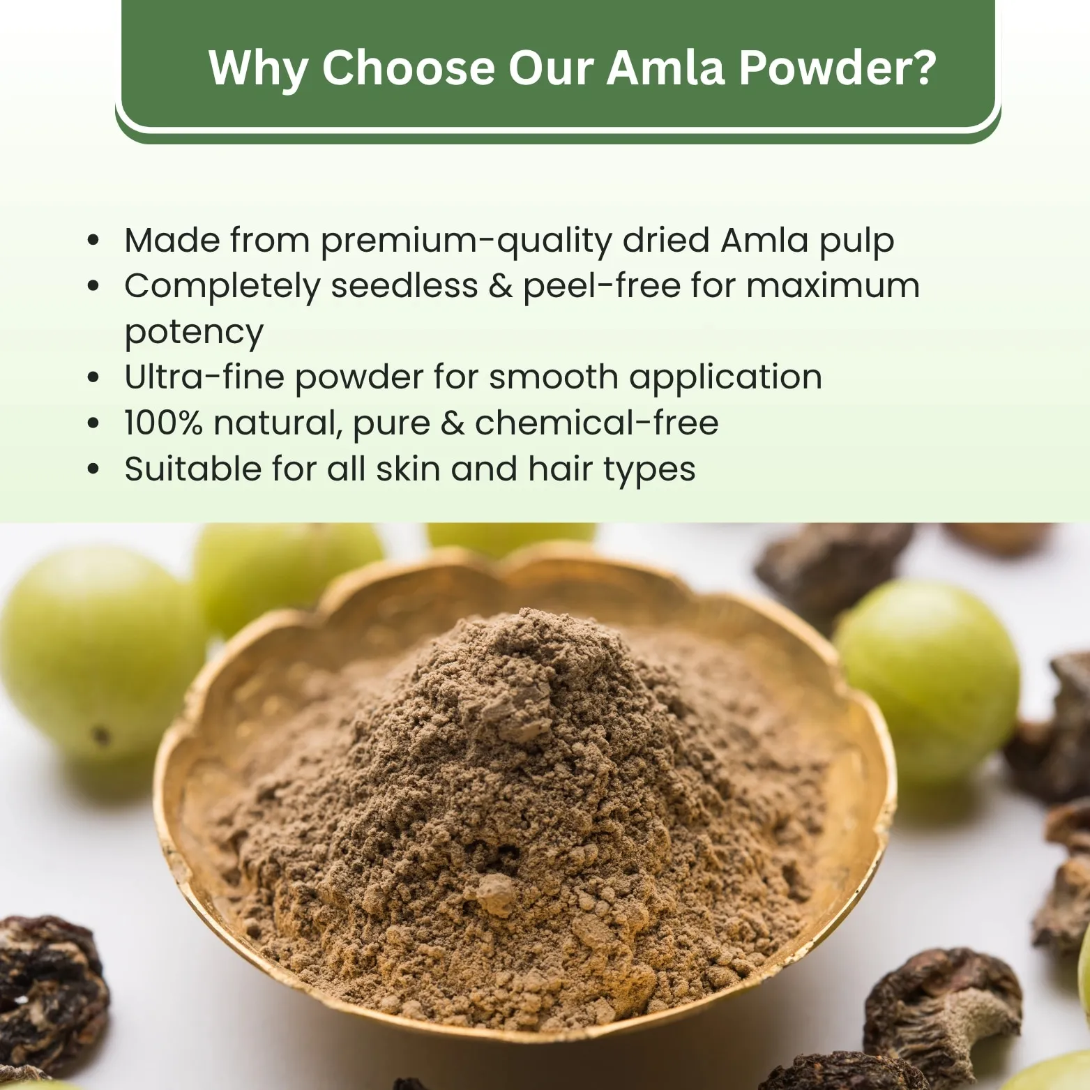 Our Amla Powder is crafted from 100% pure dried Amla pulp- completely free from seeds and peel- to retain maximum potency. It’s a powerhouse of Vitamin C and antioxidants that nourishes the scalp, boosts hair growth, reduces dandruff, and helps prevent premature greying.