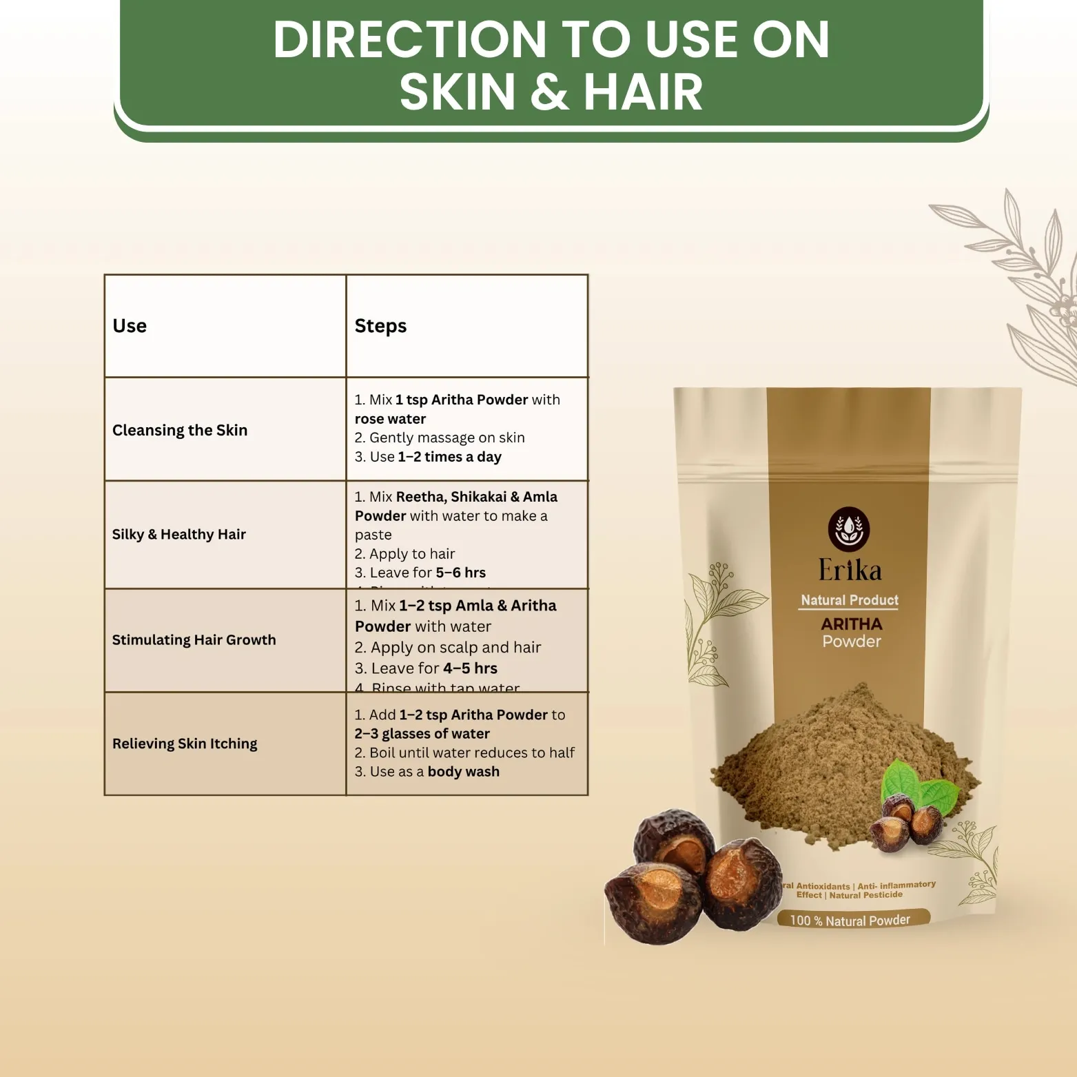 Erika Aritha Powder, also known as Soapnut powder, is a natural cleanser packed with saponins that gently purify your hair and skin without any chemicals. Ideal for hair care, it removes dirt, oil, and dandruff while strengthening roots and adding natural shine. Its antifungal properties help soothe itchy scalp and prevent scalp infections. As a skin cleanser, it removes excess oil, unclogs pores, and leaves the skin soft and refreshed. Aritha is also known for promoting hair growth and reducing hair fall. A pure, eco-friendly alternative to chemical-based shampoos and face washes for your daily routine