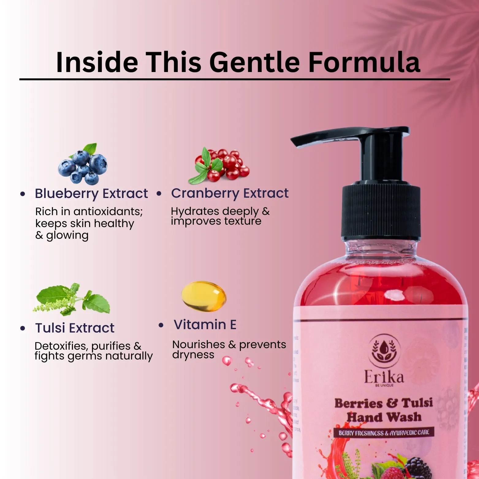 The effectiveness of Erika Berries & Tulsi Hand Wash lies in its carefully selected natural ingredients.