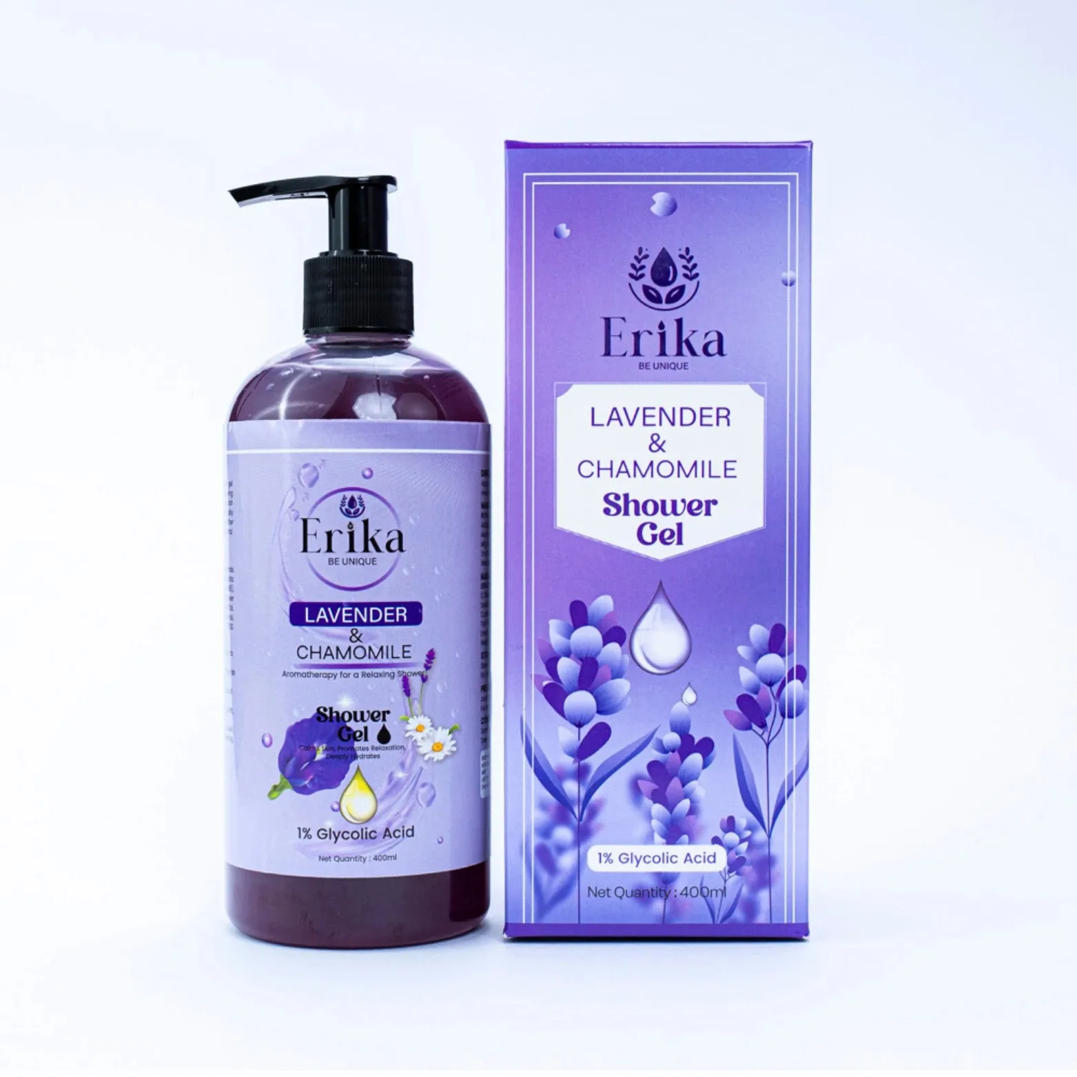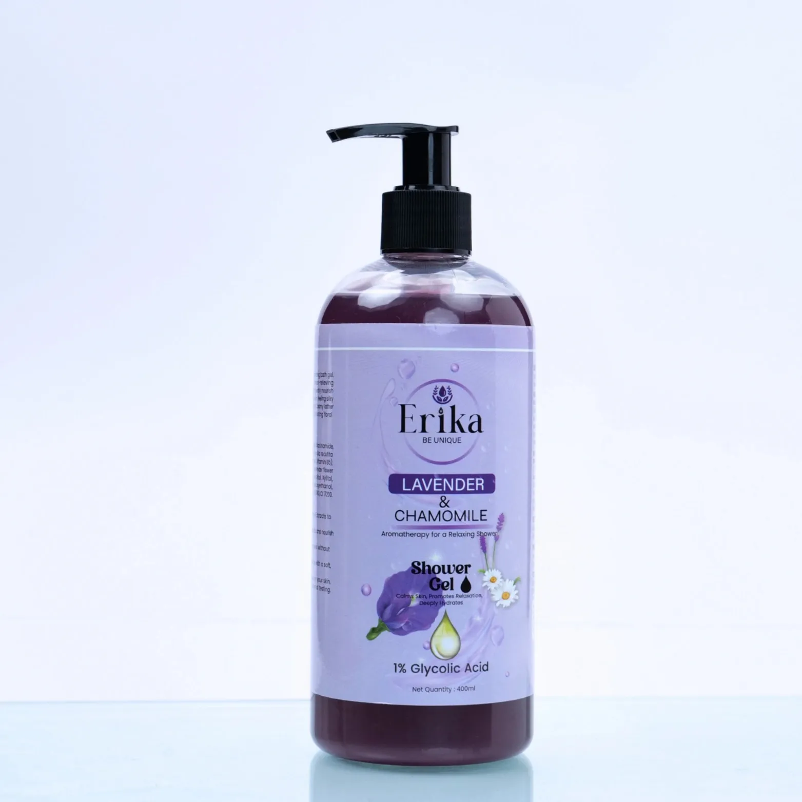 [Image: Erika Lavender & Chamomile Shower Gel bottle – alt text: “Erika Lavender & Chamomile Shower Gel”]