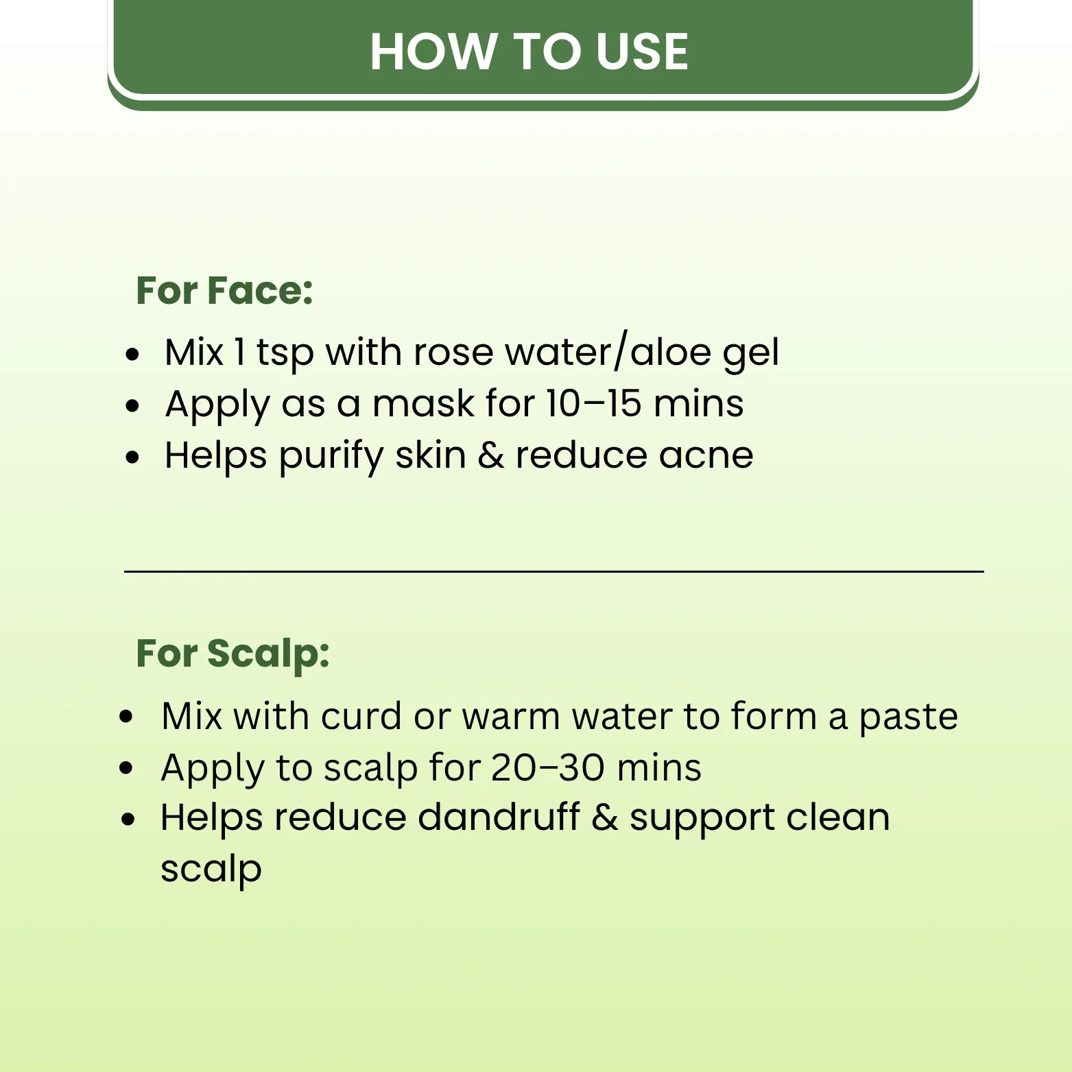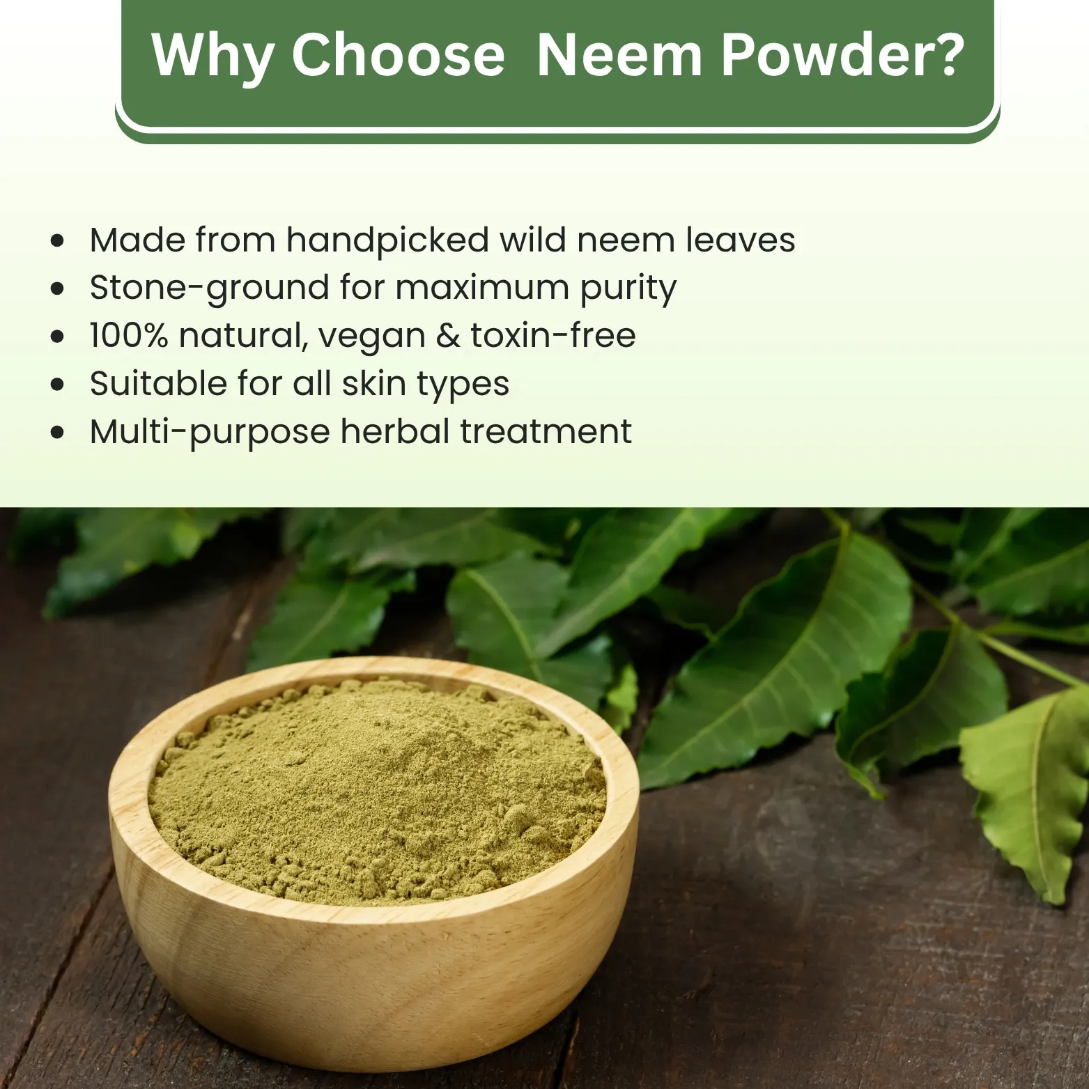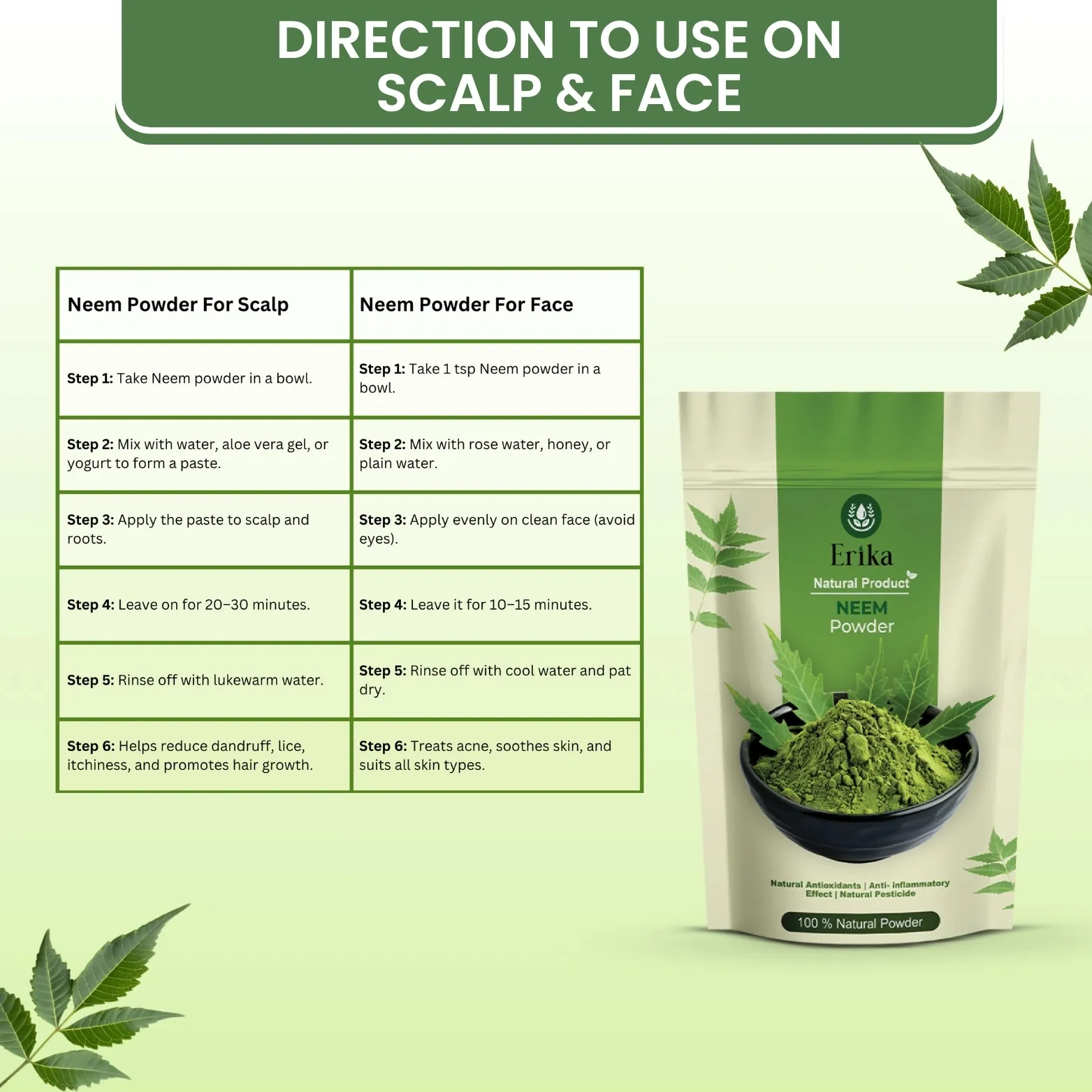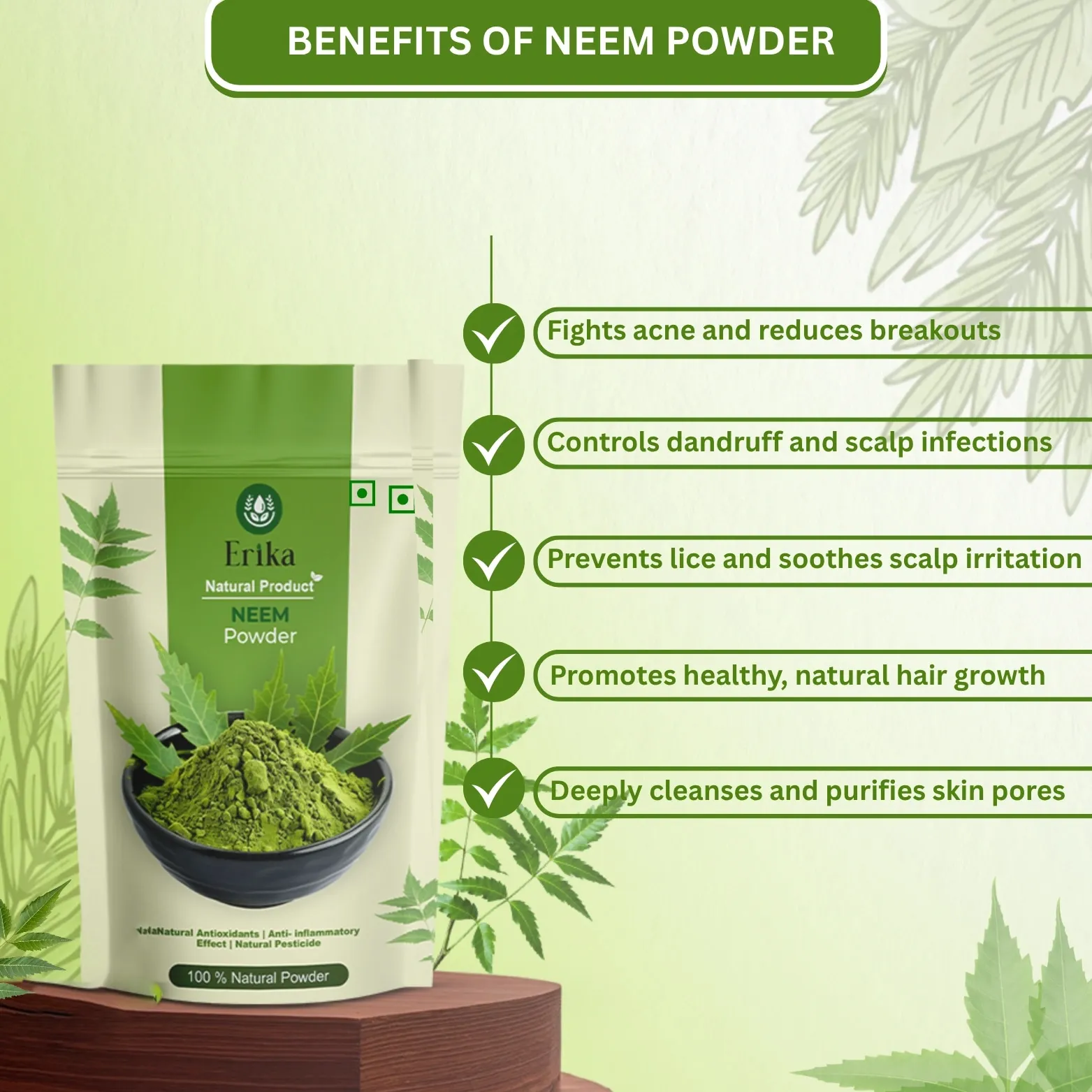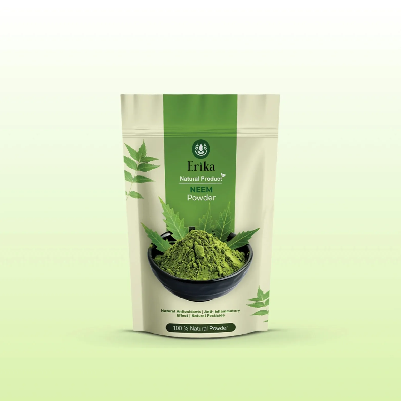 Erika Neem Powder is made from 100% dried wild neem leaves, known for their natural antibacterial, anti-fungal, and anti-inflammatory properties. It helps treat acne-prone skin, soothes irritation, and reduces blemishes.
