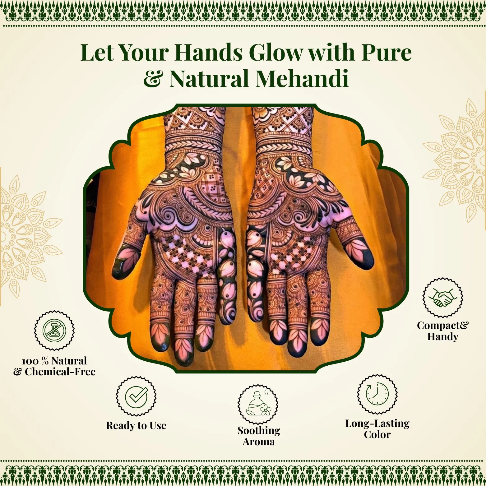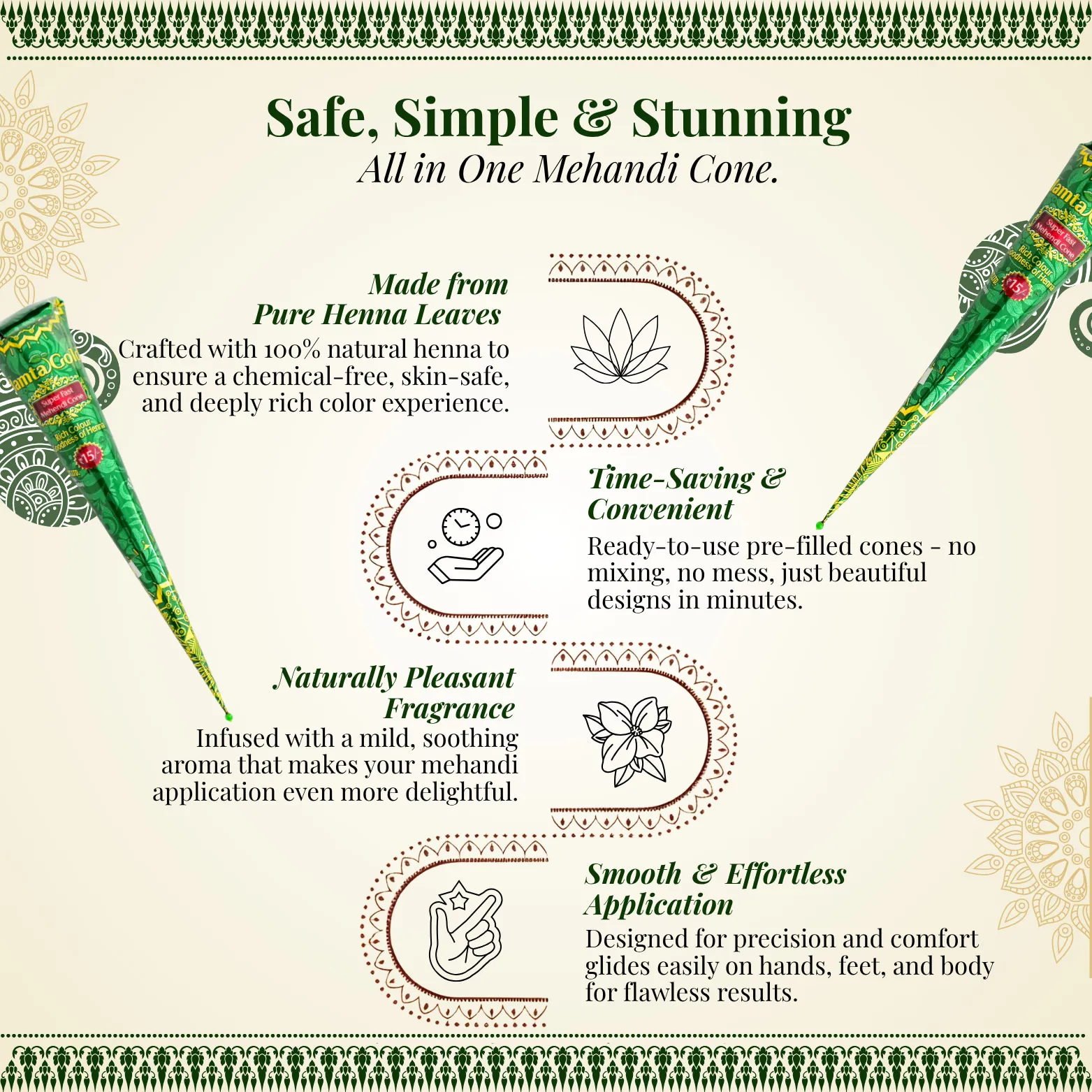 Mamta Gold Mehandi Cone is a high-quality, skin-friendly mehndi cone made from natural ingredients, offering a vibrant and long-lasting color in just a short time. Its quick-drying formula makes it ideal for last-minute festive preparations. The cone has a smooth and easy-flow texture, allowing precise and artistic designs for both beginners and professionals. It is safe to use on hands and feet, with no harsh chemicals, and leaves behind a natural herbal fragrance. Perfect for weddings, festivals, and traditional ceremonies, this cone delivers rich red-brown hues that stay bright and beautiful. The cone is lightweight, portable, and easy to use, making it a favorite choice for mehndi lovers.