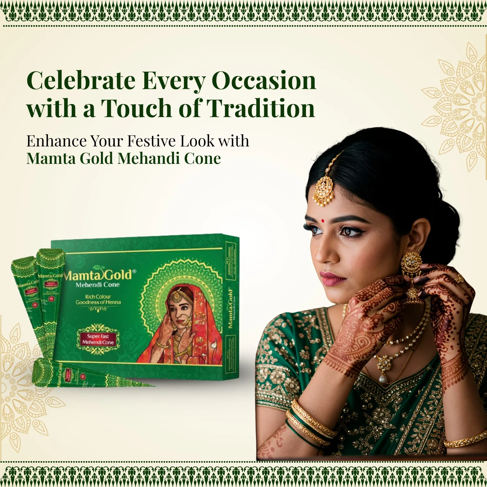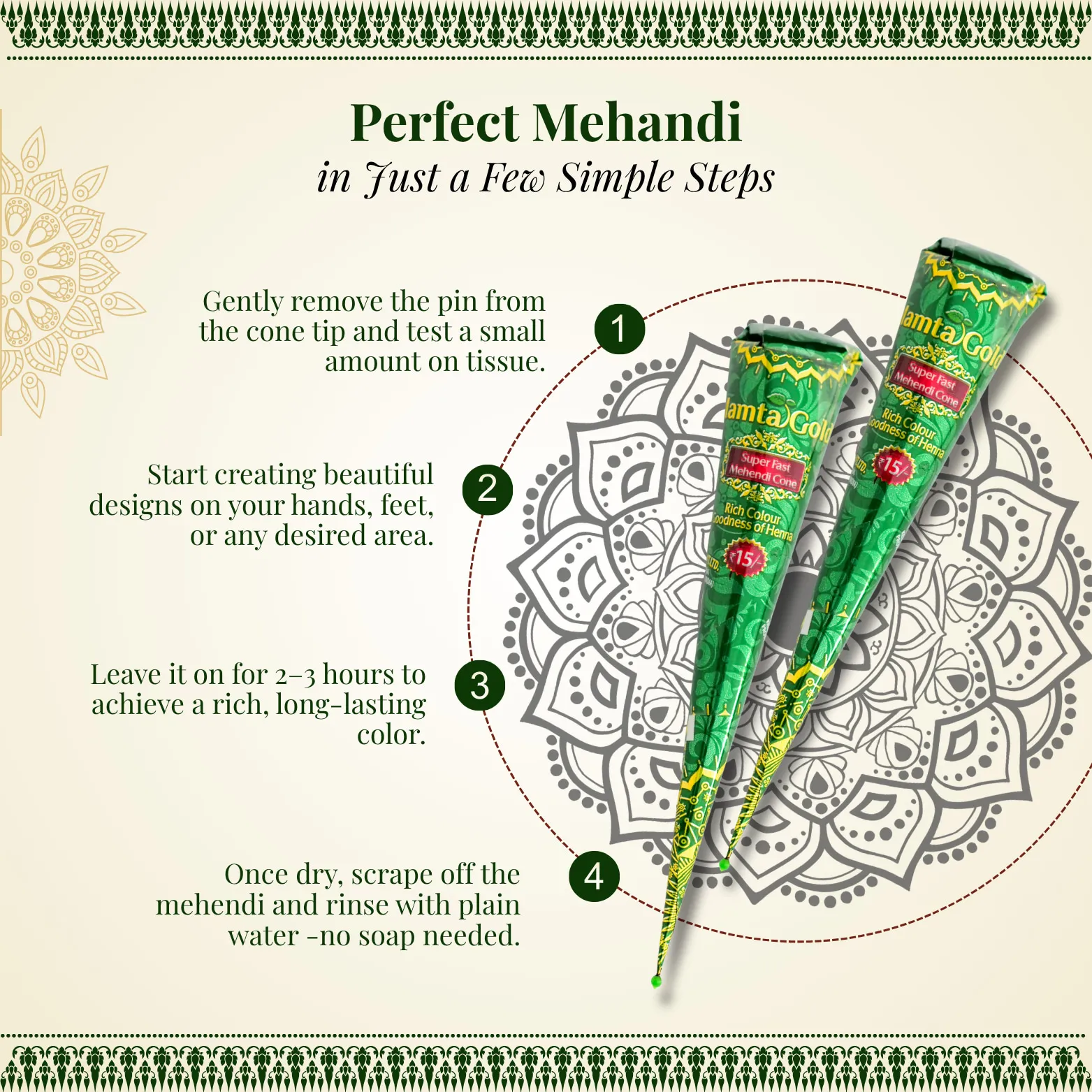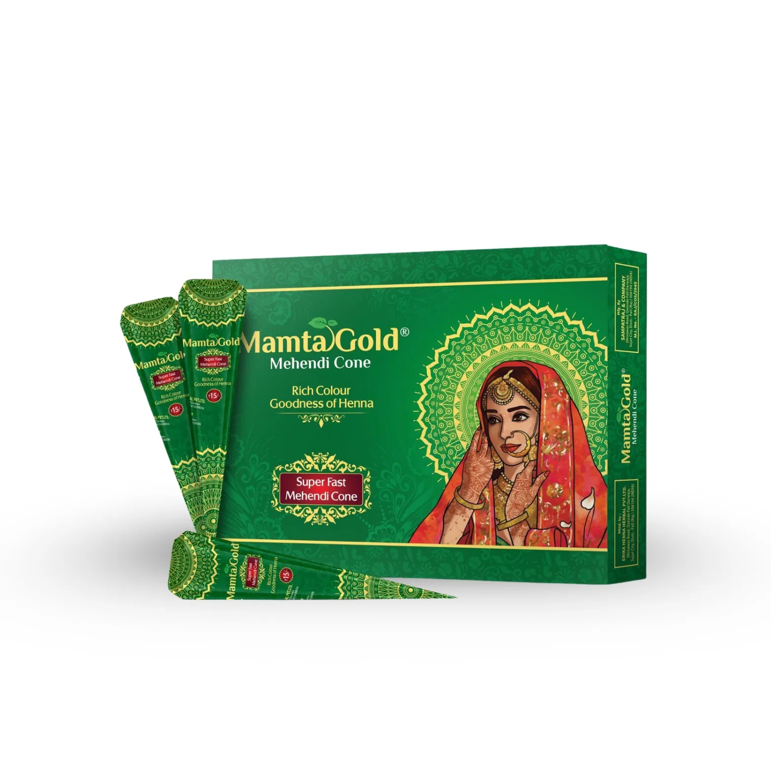 Mamta Gold Mehandi Cone is a high-quality, skin-friendly mehndi cone made from natural ingredients, offering a vibrant and long-lasting color in just a short time. Its quick-drying formula makes it ideal for last-minute festive preparations.
