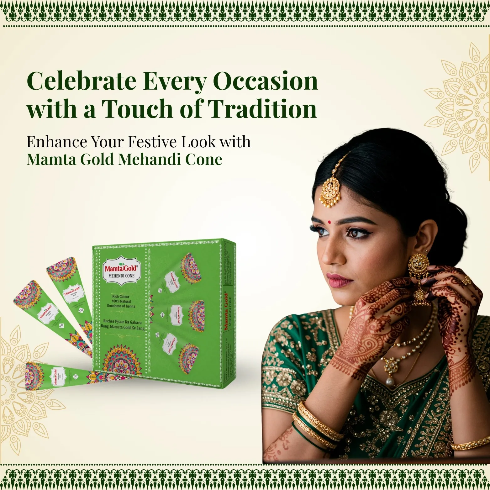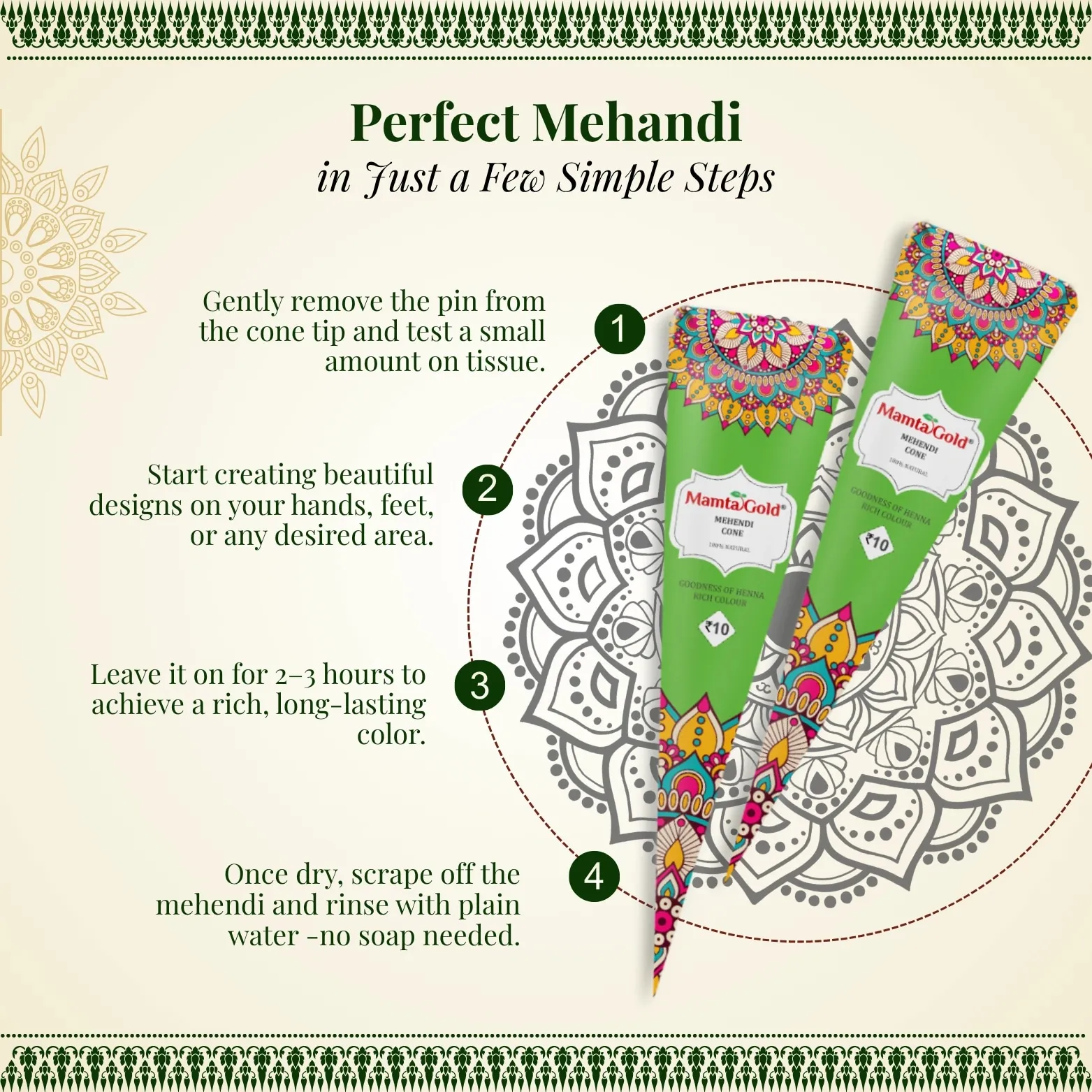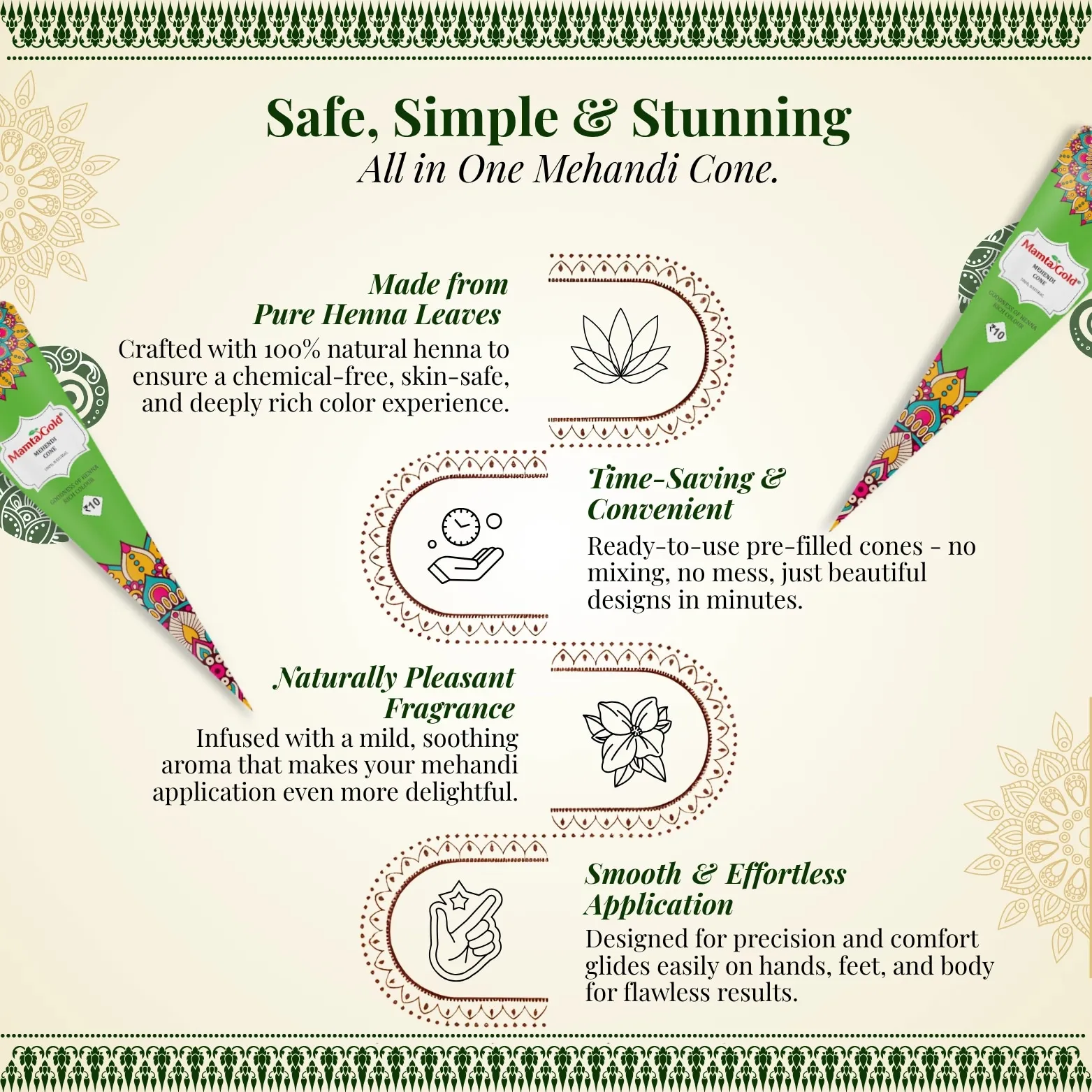 Mamta Gold Mehandi Cone offers a rich, authentic mehandi experience with 100% natural henna leaves and essential oils for deep, long-lasting color. Perfect for weddings, festivals, and special occasions, it ensures smooth application and vibrant results.