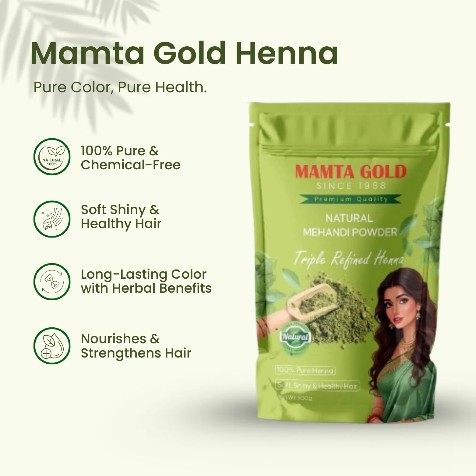 Mamta Gold Mehandi Powder is a 100% natural product made from premium quality henna leaves sourced from Sojat, Rajasthan. Known for its smooth texture and easy application, it delivers a rich, dark, and long-lasting color.
